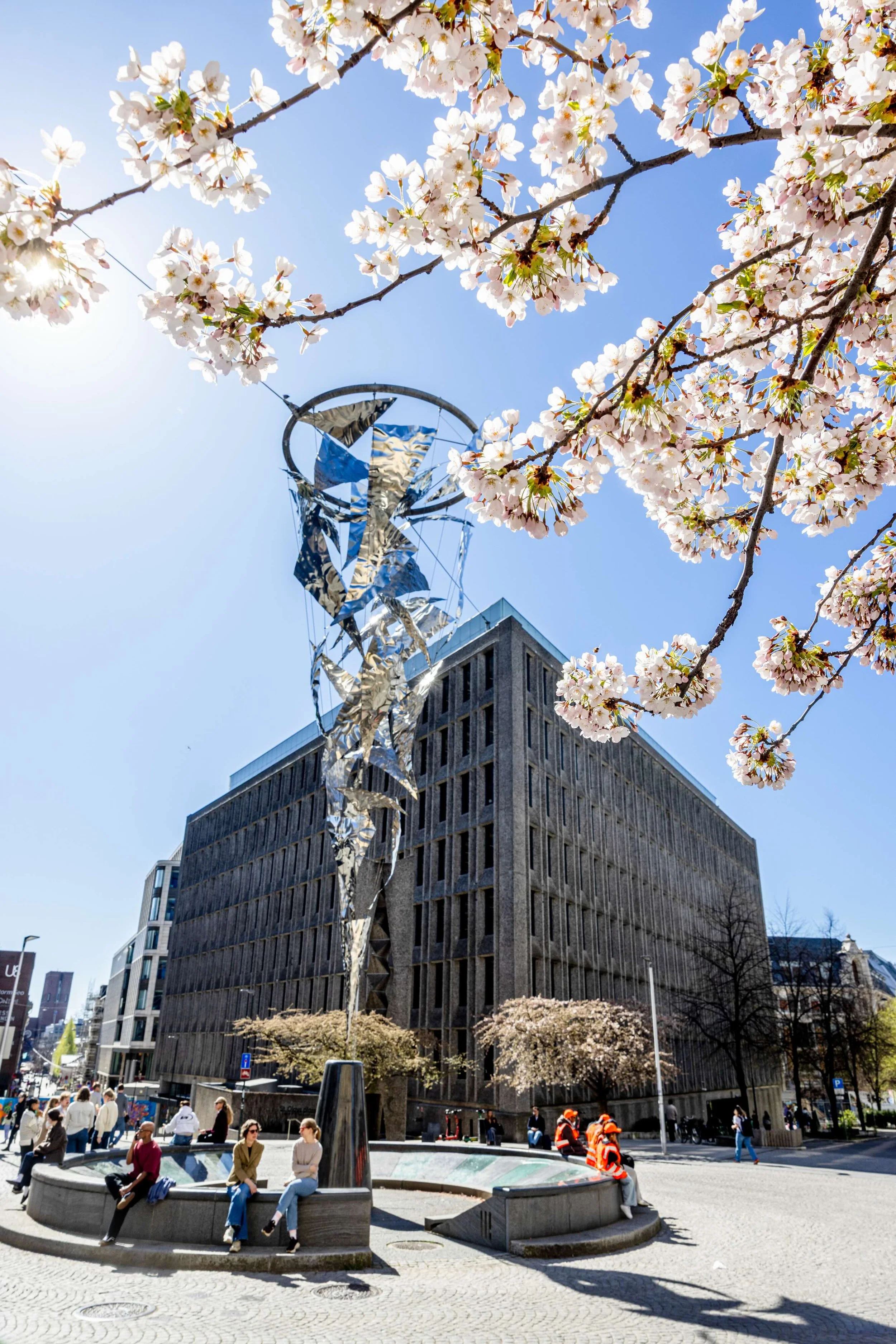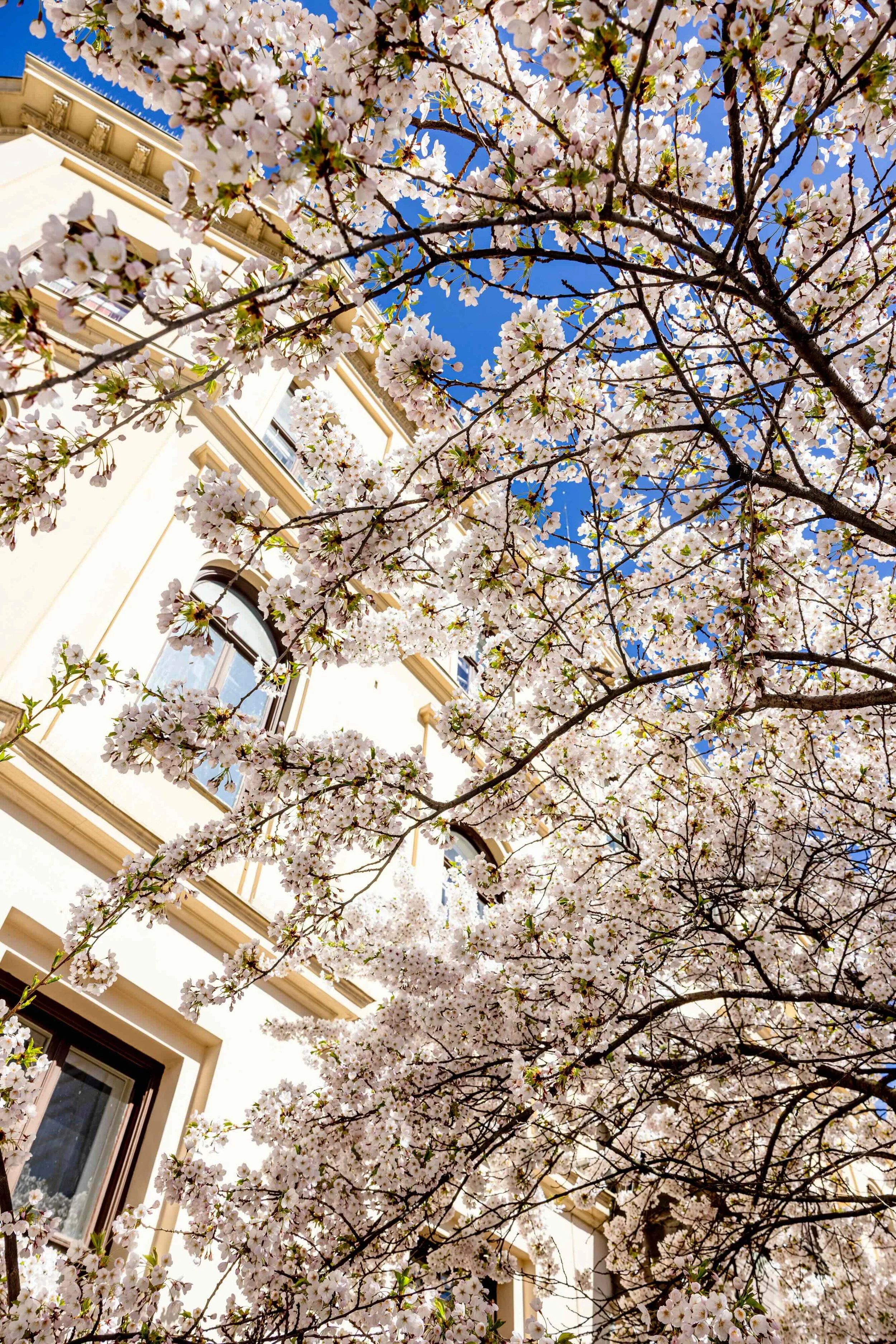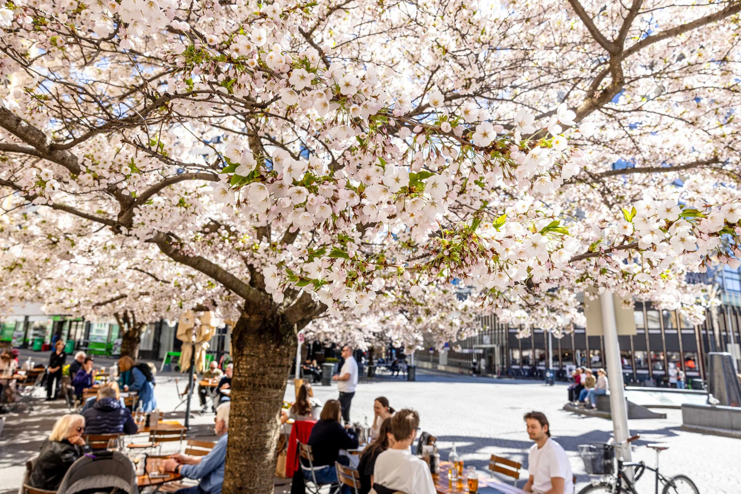 Kirsebærblomstringen har eksplodert på St. Olavs plass. Foto: Torleif Kvinnesland