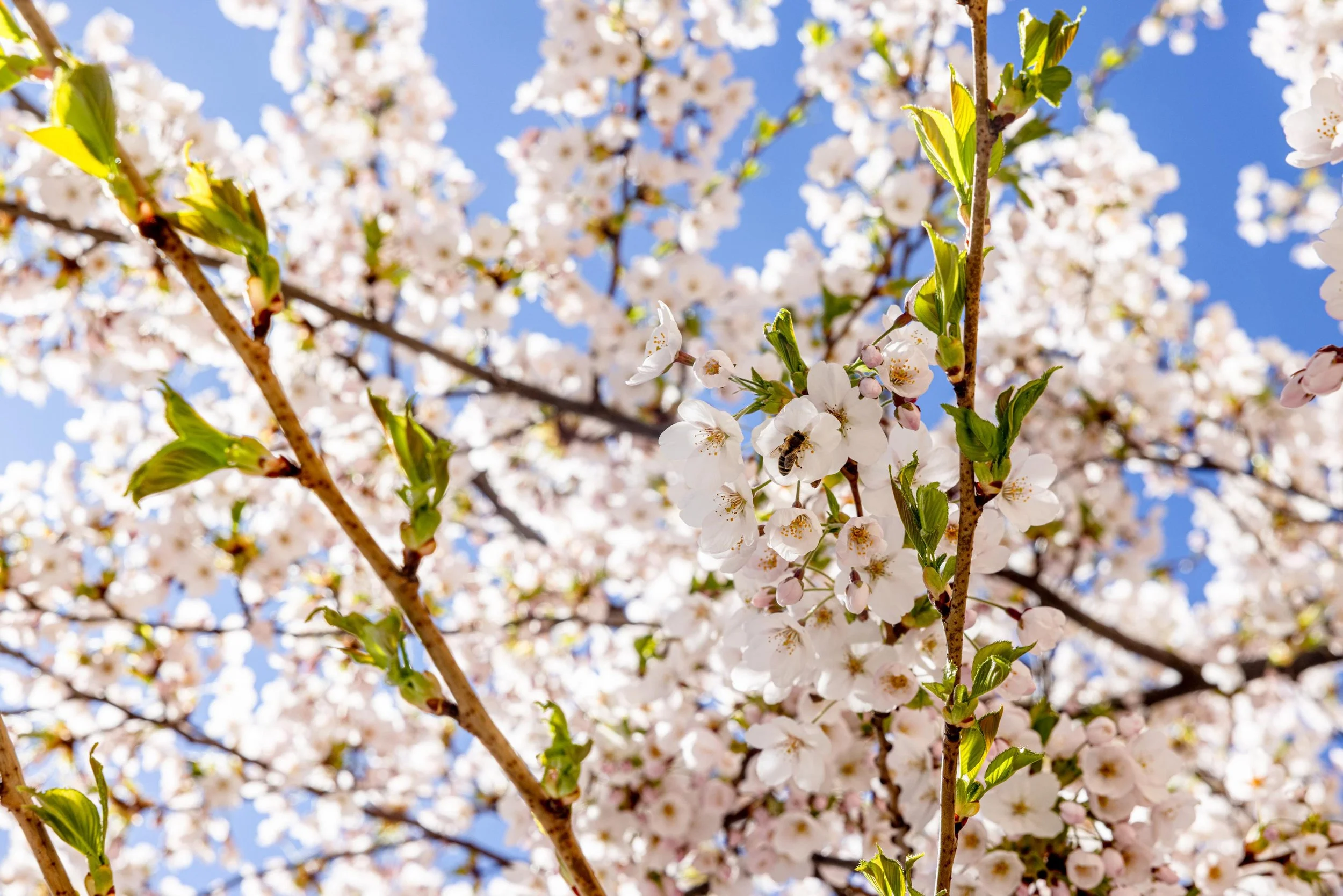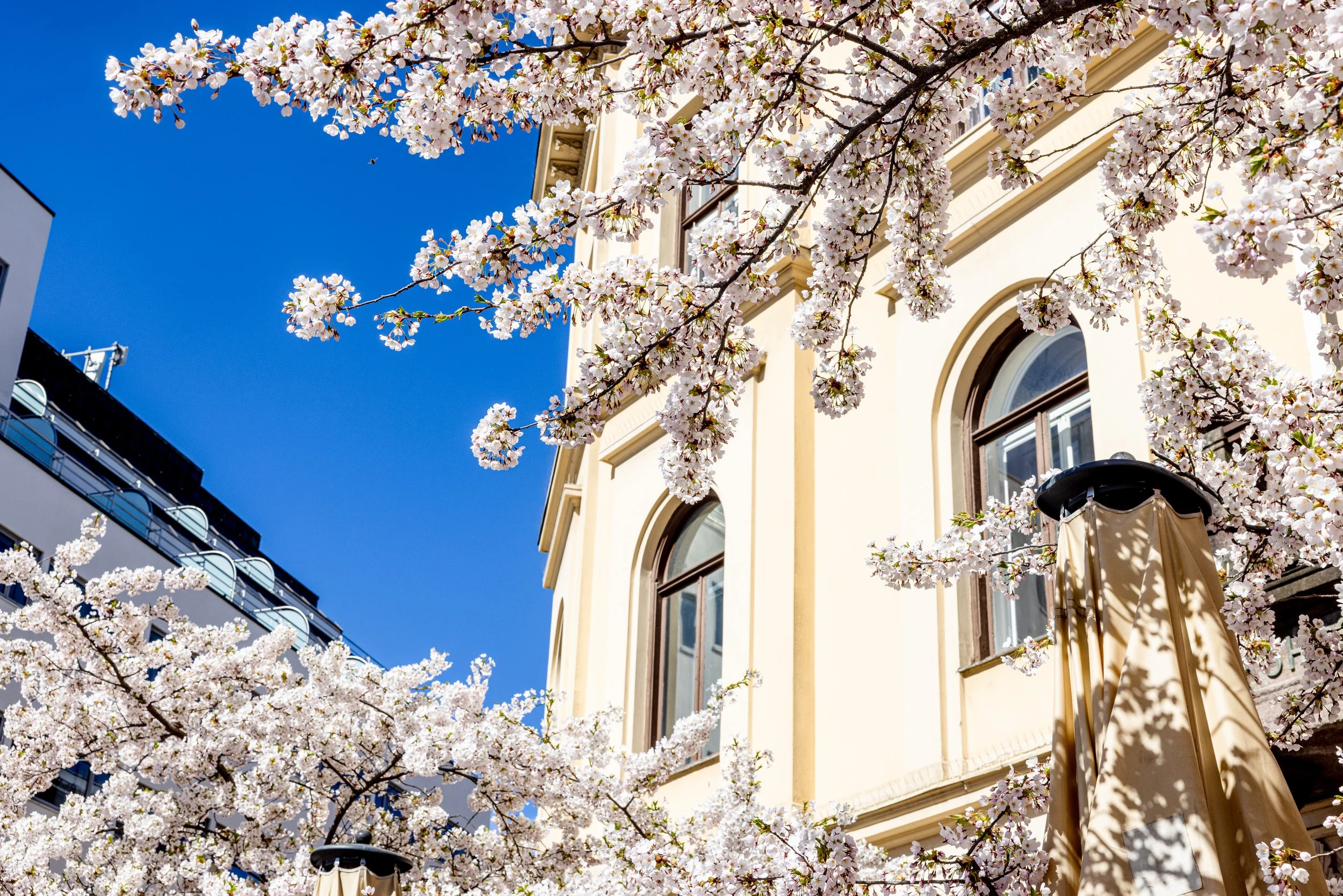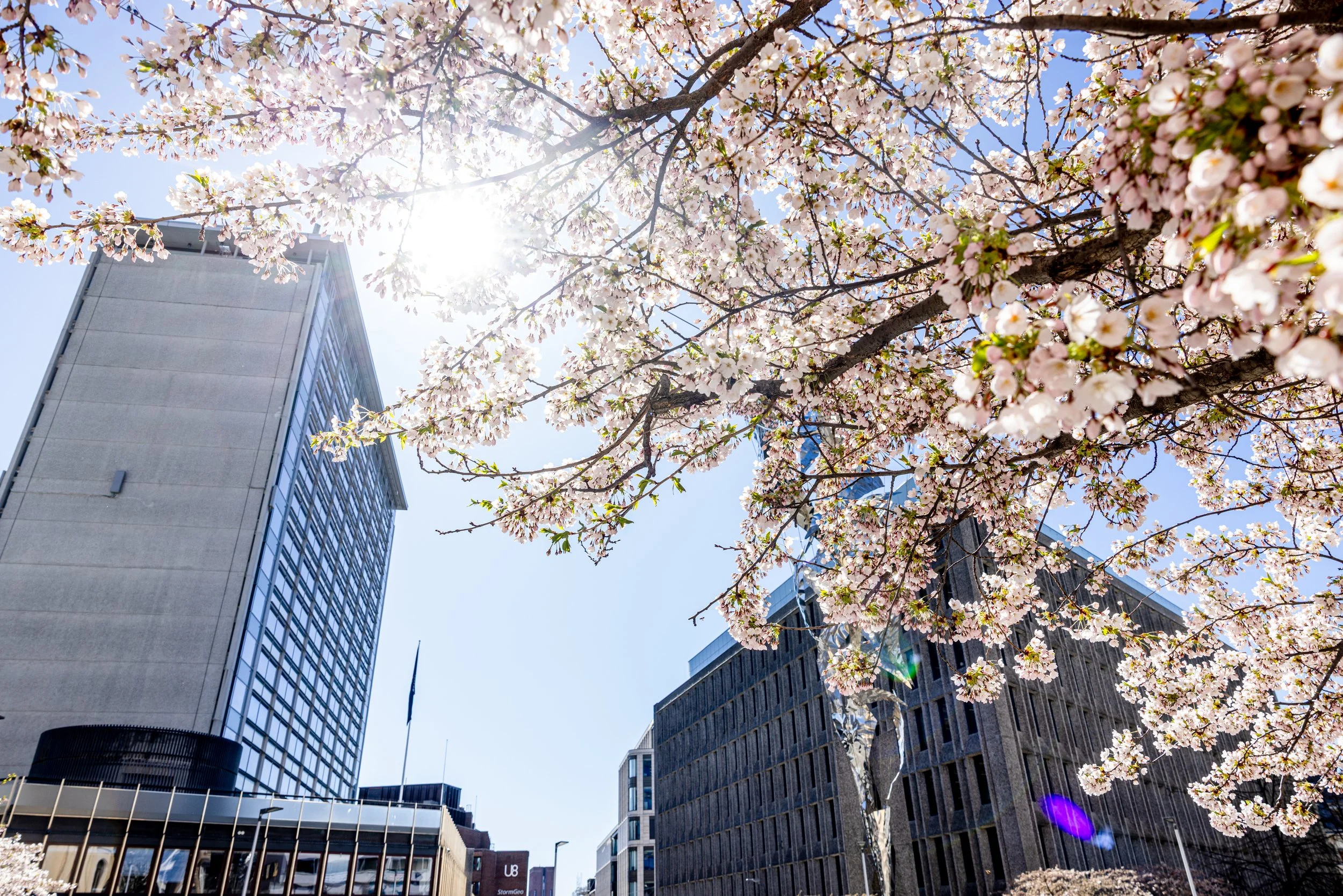 Kirsebærblomstringen har eksplodert på St. Olavs plass. Foto: Torleif Kvinnesland