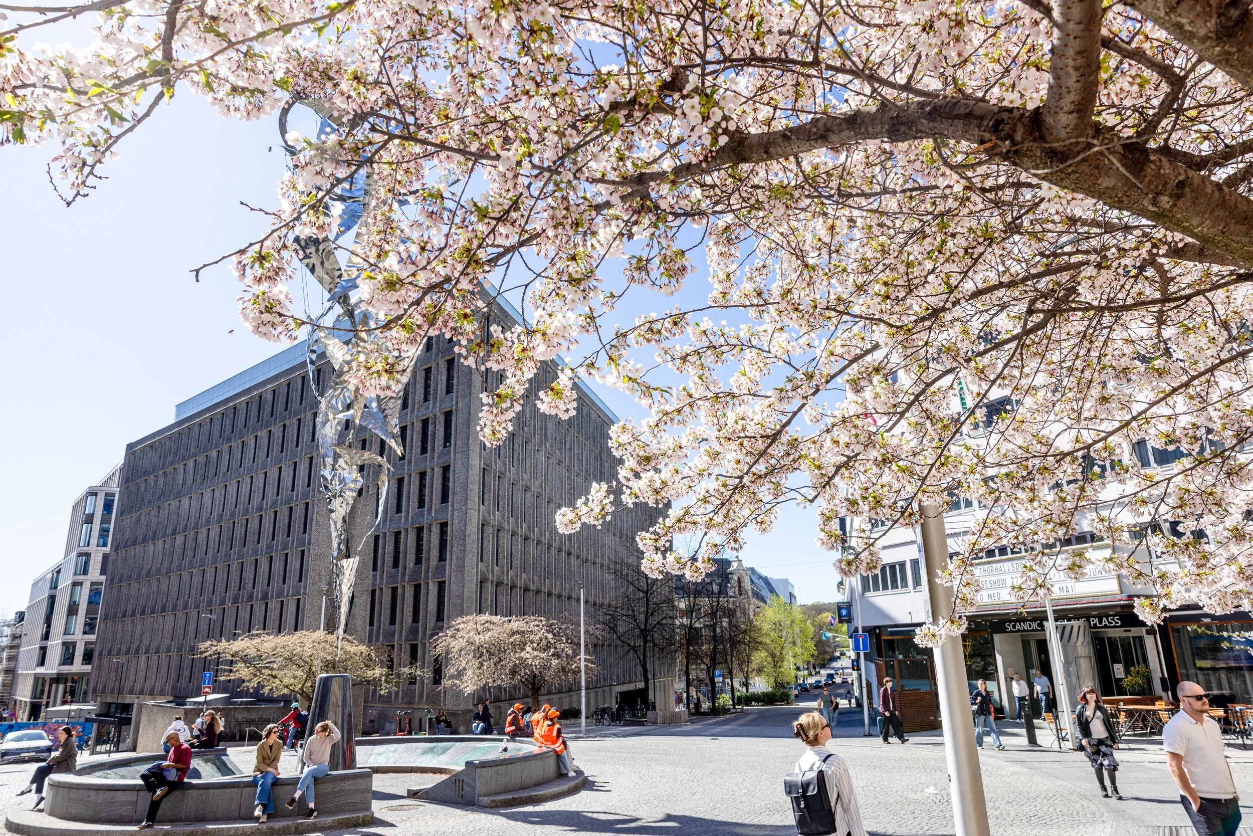 Nå er det helt fantastisk på St. Olavs plass, midt på Tullin. Kirsebærtrærne står i full blomst, og vår fotograf Torleif Kvinnesland har foreviget dette.